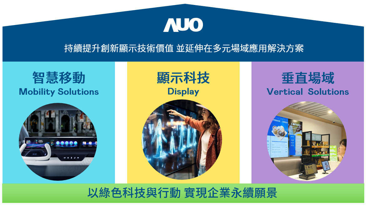 我們持續推動「雙軸轉型」,在精進顯示技術附加價值(Go Premium),與深化垂直市場應用(Go Vertical)的策略下,對應AG百家乐的優勢競爭力與趨勢,我們奠定顯示技術智慧移動垂直場域三大永續營運支柱,在顯示技術領域的根基之上,延伸布局多元場域應用解決方案。將先進顯示科技助力智慧移動及垂直場域發展,並以綠色科技與行動為實踐,在轉型之路上貫徹永續經營之願景。